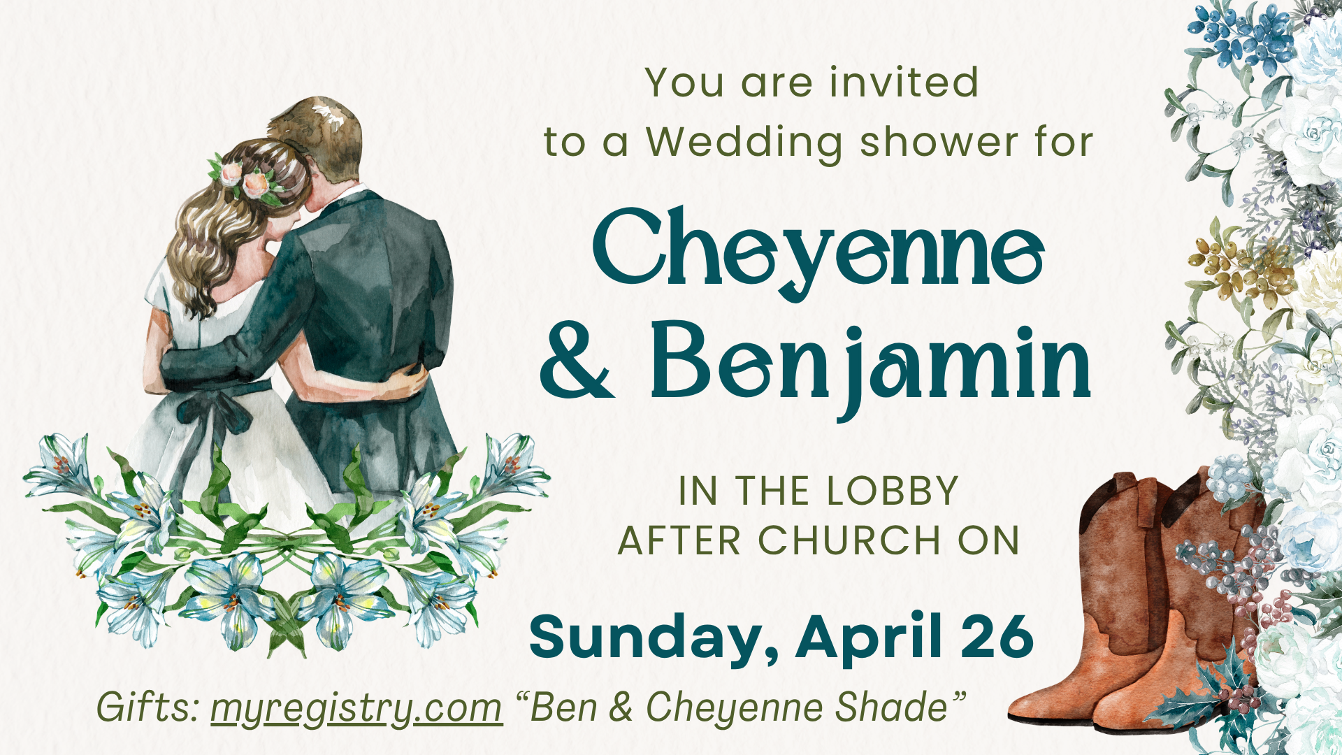 Ben & Cheyenne Wedding Shower after church Sunday, April 26, 2026 11:30 AM 12:30 PM Google Calendar ICS