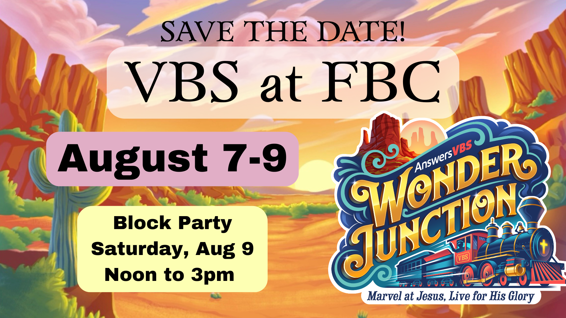 VBS at FBC: Thursday Aug 078–Sat Aug 9